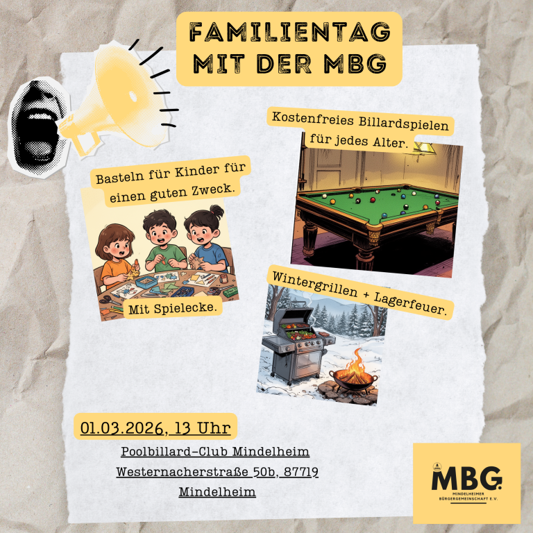 All das erleben Sie auf dem MBG Familientag am 01.03.2026, ab 13:00 Uhr im Poolbillard-Club Mindelheim, Westernacher Straße 50b.